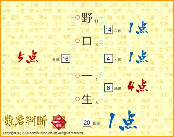 生活面を象徴する運勢です。外部から受ける影響力を表し、結婚運、家庭運や職場、環境への順応性を表します。総運から人運を引いた画数。姓や名が1文字の場合を除く。