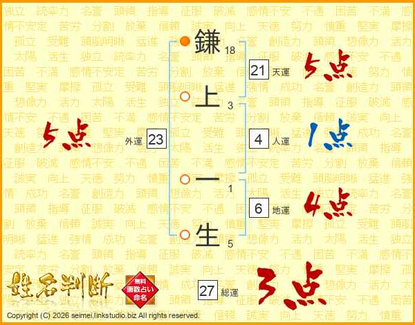 鎌上一生さんの天運は21画の5点!
