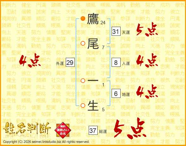 鷹尾一生さんの総運は37画の5点!