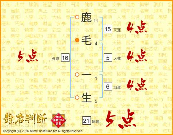 鹿毛一生さんの総運は21画の5点!
