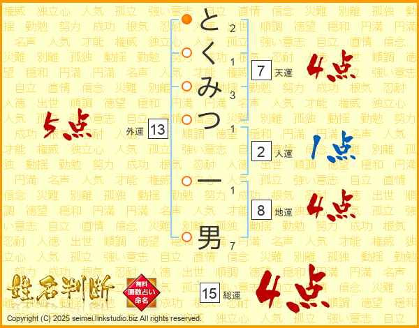 とくみつ一男さんの総運は15画の4点!