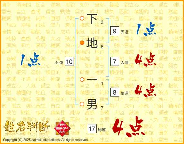 生活面を象徴する運勢です。外部から受ける影響力を表し、結婚運、家庭運や職場、環境への順応性を表します。総運から人運を引いた画数。姓や名が1文字の場合を除く。