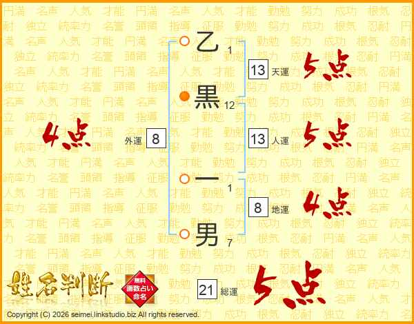 乙黒一男さんの天運は13画の5点!