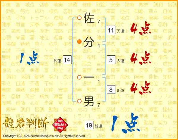 生活面を象徴する運勢です。外部から受ける影響力を表し、結婚運、家庭運や職場、環境への順応性を表します。総運から人運を引いた画数。姓や名が1文字の場合を除く。