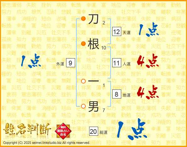 生活面を象徴する運勢です。外部から受ける影響力を表し、結婚運、家庭運や職場、環境への順応性を表します。総運から人運を引いた画数。姓や名が1文字の場合を除く。