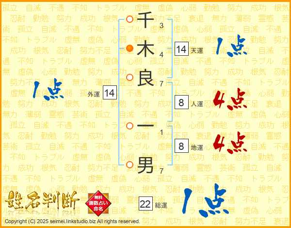 千(3画)木(4画)良(7画) 一(1画)男(7画)