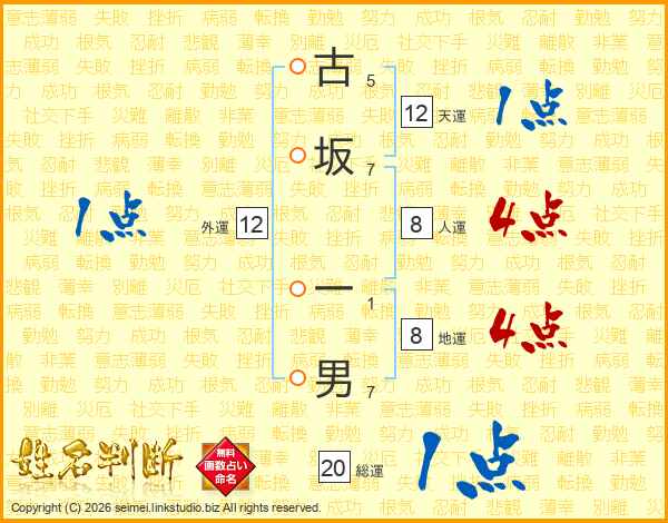生活面を象徴する運勢です。外部から受ける影響力を表し、結婚運、家庭運や職場、環境への順応性を表します。総運から人運を引いた画数。姓や名が1文字の場合を除く。