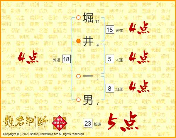 生活面を象徴する運勢です。外部から受ける影響力を表し、結婚運、家庭運や職場、環境への順応性を表します。総運から人運を引いた画数。姓や名が1文字の場合を除く。