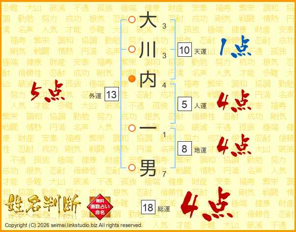 生活面を象徴する運勢です。外部から受ける影響力を表し、結婚運、家庭運や職場、環境への順応性を表します。総運から人運を引いた画数。姓や名が1文字の場合を除く。