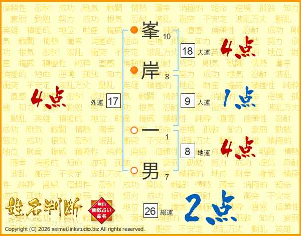 生活面を象徴する運勢です。外部から受ける影響力を表し、結婚運、家庭運や職場、環境への順応性を表します。総運から人運を引いた画数。姓や名が1文字の場合を除く。