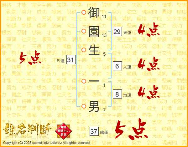 御(11画)園(13画)生(5画) 一(1画)男(7画)