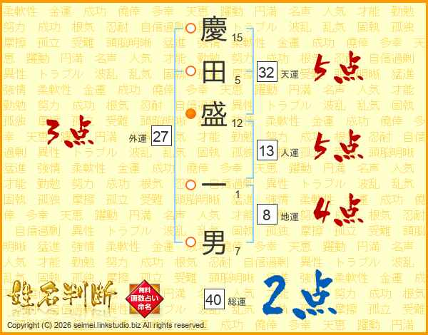 慶田盛一男さんの総運は40画の2点!