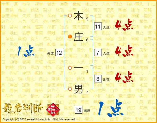 生活面を象徴する運勢です。外部から受ける影響力を表し、結婚運、家庭運や職場、環境への順応性を表します。総運から人運を引いた画数。姓や名が1文字の場合を除く。