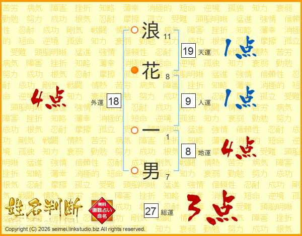 あなたの人生を表す1番重要な運勢です。生涯を通じて影響する総合運となり、主に50歳以降の晩年期に影響を及ぼします。苗字と名前の合計画数。