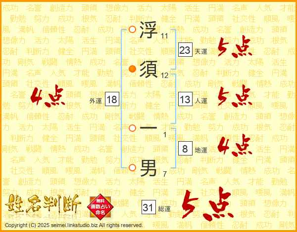生活面を象徴する運勢です。外部から受ける影響力を表し、結婚運、家庭運や職場、環境への順応性を表します。総運から人運を引いた画数。姓や名が1文字の場合を除く。