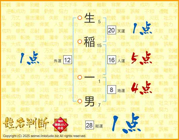 生活面を象徴する運勢です。外部から受ける影響力を表し、結婚運、家庭運や職場、環境への順応性を表します。総運から人運を引いた画数。姓や名が1文字の場合を除く。