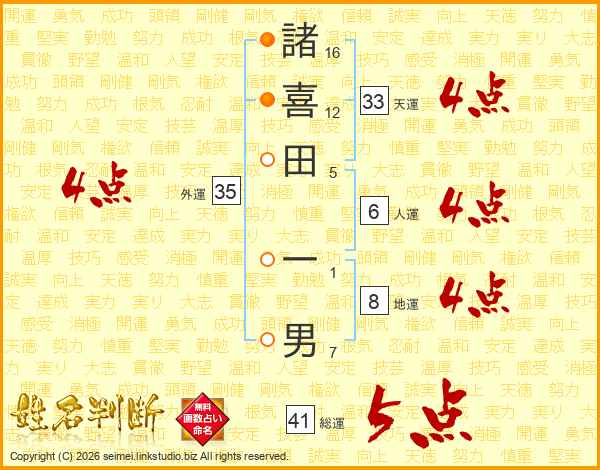 諸(16画)喜(12画)田(5画) 一(1画)男(7画)