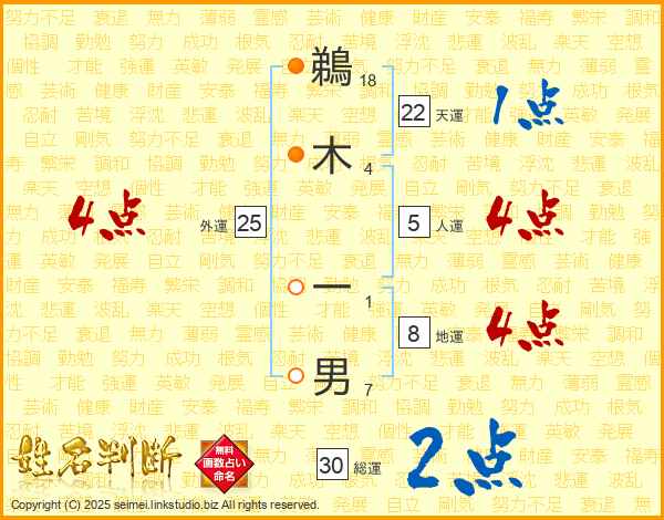 あなたの人生を表す1番重要な運勢です。生涯を通じて影響する総合運となり、主に50歳以降の晩年期に影響を及ぼします。苗字と名前の合計画数。