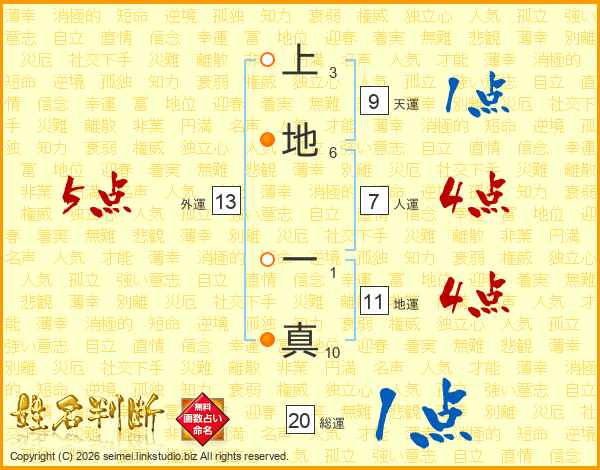 生活面を象徴する運勢です。外部から受ける影響力を表し、結婚運、家庭運や職場、環境への順応性を表します。総運から人運を引いた画数。姓や名が1文字の場合を除く。