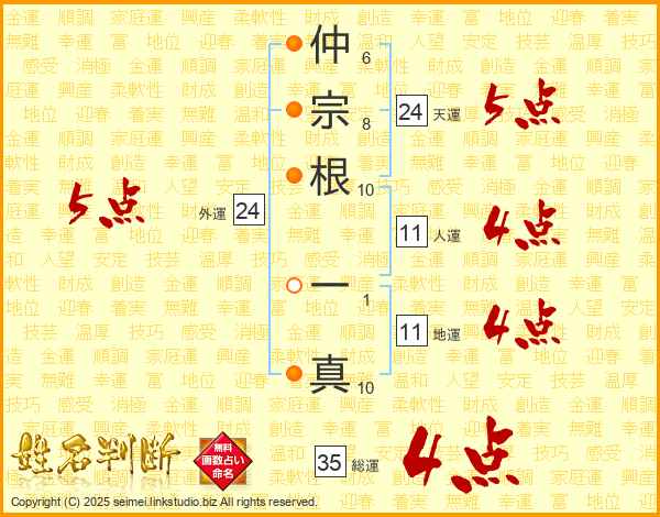 仲(6画)宗(8画)根(10画) 一(1画)真(10画)