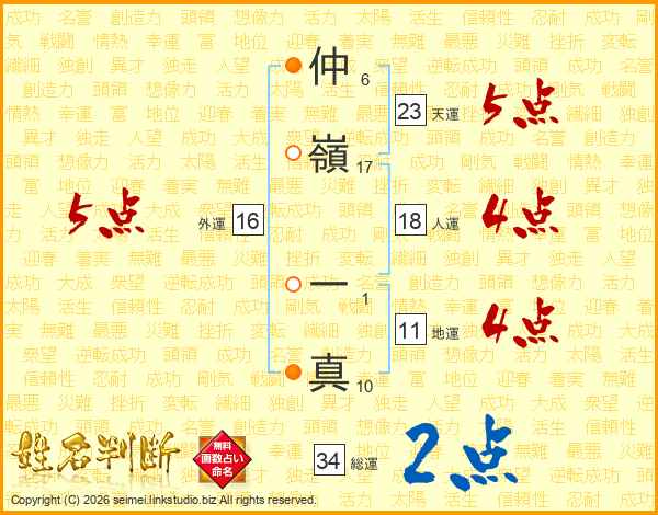 仲(6画)嶺(17画) 一(1画)真(10画)