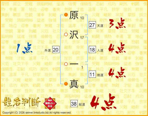 生活面を象徴する運勢です。外部から受ける影響力を表し、結婚運、家庭運や職場、環境への順応性を表します。総運から人運を引いた画数。姓や名が1文字の場合を除く。