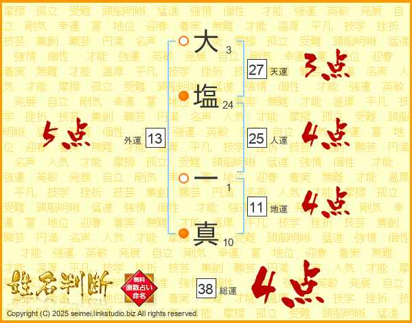 生活面を象徴する運勢です。外部から受ける影響力を表し、結婚運、家庭運や職場、環境への順応性を表します。総運から人運を引いた画数。姓や名が1文字の場合を除く。