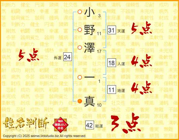 小(3画)野(11画)澤(17画) 一(1画)真(10画)
