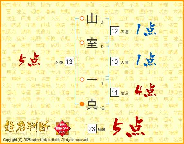 あなたの人生を表す1番重要な運勢です。生涯を通じて影響する総合運となり、主に50歳以降の晩年期に影響を及ぼします。苗字と名前の合計画数。