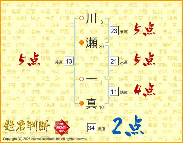 生活面を象徴する運勢です。外部から受ける影響力を表し、結婚運、家庭運や職場、環境への順応性を表します。総運から人運を引いた画数。姓や名が1文字の場合を除く。