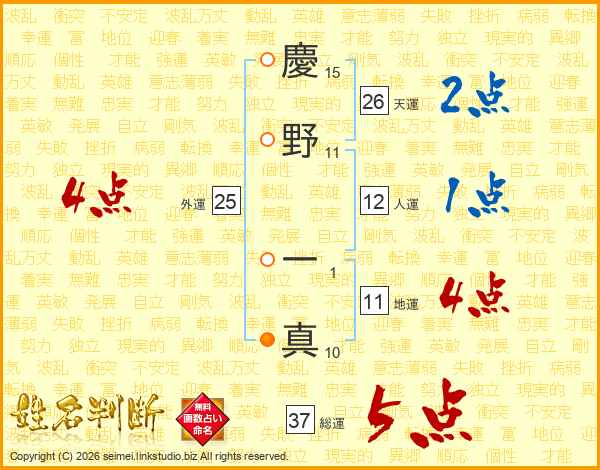 あなたの人生を表す1番重要な運勢です。生涯を通じて影響する総合運となり、主に50歳以降の晩年期に影響を及ぼします。苗字と名前の合計画数。