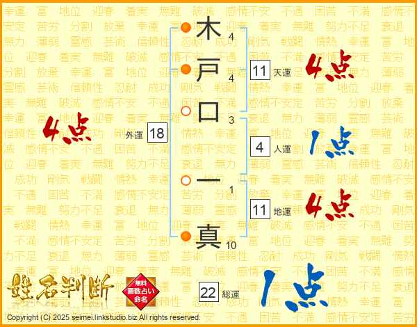 木(4画)戸(4画)口(3画) 一(1画)真(10画)