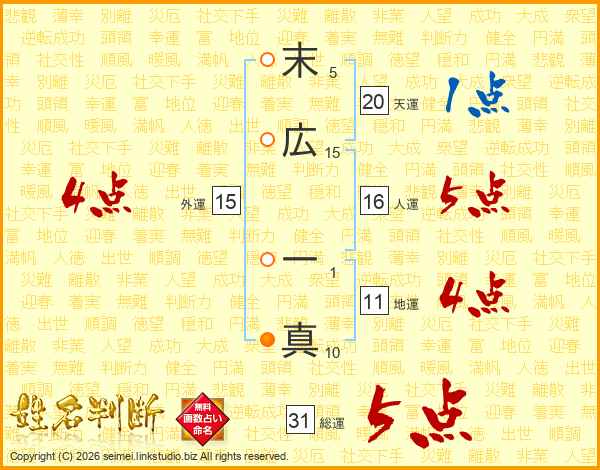末(5画)広(15画) 一(1画)真(10画)