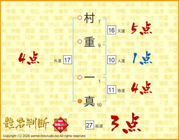 村(7画)重(9画) 一(1画)真(10画)