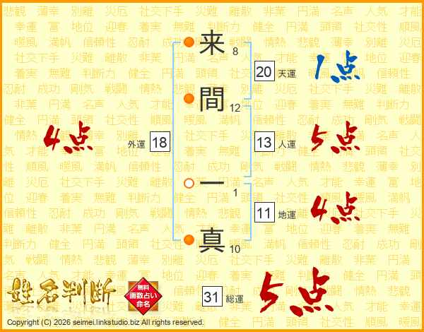 来(8画)間(12画) 一(1画)真(10画)