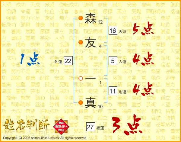 森(12画)友(4画) 一(1画)真(10画)