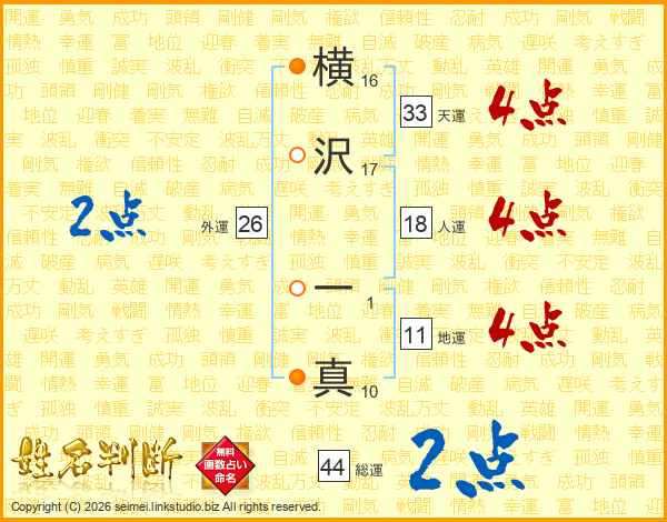 生活面を象徴する運勢です。外部から受ける影響力を表し、結婚運、家庭運や職場、環境への順応性を表します。総運から人運を引いた画数。姓や名が1文字の場合を除く。