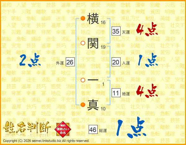 生活面を象徴する運勢です。外部から受ける影響力を表し、結婚運、家庭運や職場、環境への順応性を表します。総運から人運を引いた画数。姓や名が1文字の場合を除く。