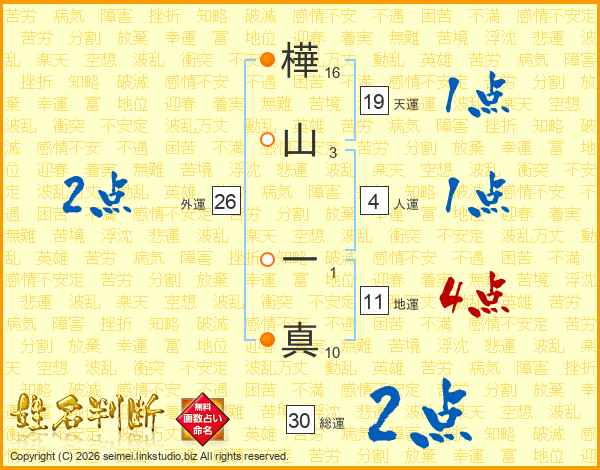 あなたの人生を表す1番重要な運勢です。生涯を通じて影響する総合運となり、主に50歳以降の晩年期に影響を及ぼします。苗字と名前の合計画数。