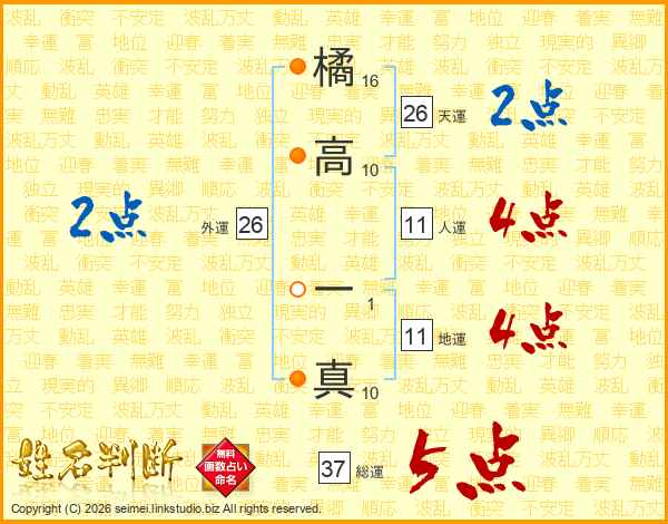 あなたの人生を表す1番重要な運勢です。生涯を通じて影響する総合運となり、主に50歳以降の晩年期に影響を及ぼします。苗字と名前の合計画数。