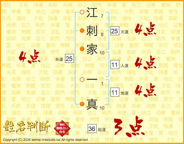 生活面を象徴する運勢です。外部から受ける影響力を表し、結婚運、家庭運や職場、環境への順応性を表します。総運から人運を引いた画数。姓や名が1文字の場合を除く。