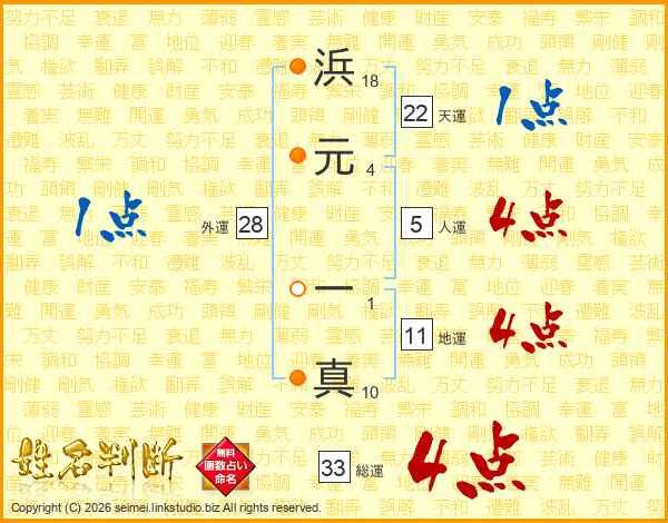 あなたの人生を表す1番重要な運勢です。生涯を通じて影響する総合運となり、主に50歳以降の晩年期に影響を及ぼします。苗字と名前の合計画数。