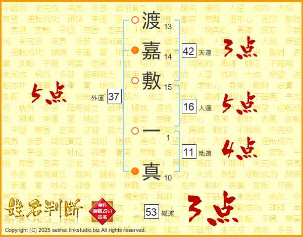 渡(13画)嘉(14画)敷(15画) 一(1画)真(10画)