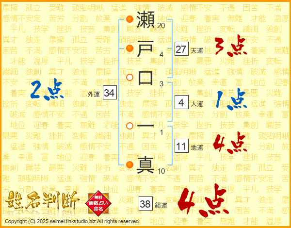 瀬(20画)戸(4画)口(3画) 一(1画)真(10画)
