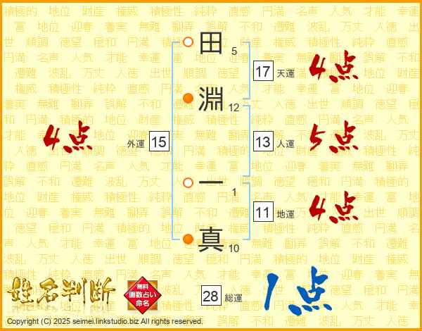 生活面を象徴する運勢です。外部から受ける影響力を表し、結婚運、家庭運や職場、環境への順応性を表します。総運から人運を引いた画数。姓や名が1文字の場合を除く。