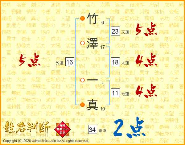 あなたの人生を表す1番重要な運勢です。生涯を通じて影響する総合運となり、主に50歳以降の晩年期に影響を及ぼします。苗字と名前の合計画数。