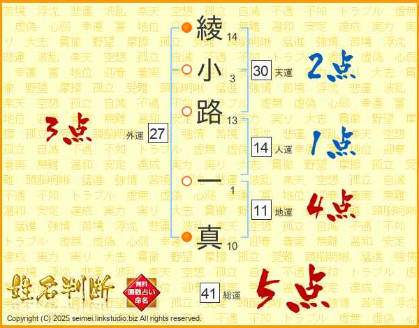 綾(14画)小(3画)路(13画) 一(1画)真(10画)