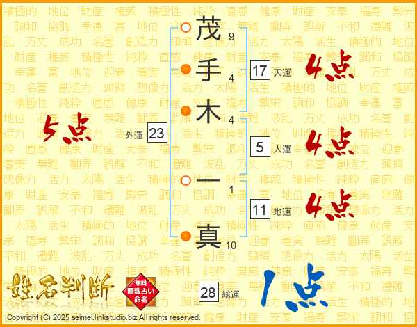 茂(9画)手(4画)木(4画) 一(1画)真(10画)