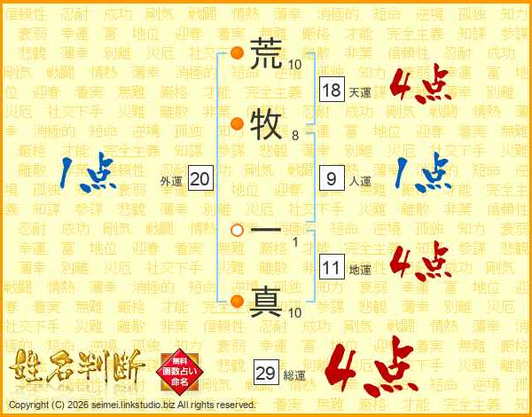 生活面を象徴する運勢です。外部から受ける影響力を表し、結婚運、家庭運や職場、環境への順応性を表します。総運から人運を引いた画数。姓や名が1文字の場合を除く。