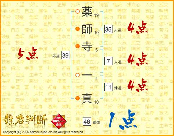 薬(19画)師(10画)寺(6画) 一(1画)真(10画)